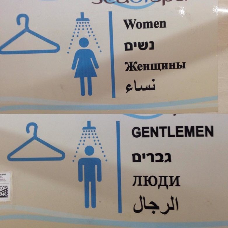 Ну, это калька с английского. Там «человек вообще» и «мужчина» — синонимы. Вот только к аудитории из мужчин и женщин обращаются «Леди и джентьльмены». А последняя вывеска, видимо, где-то, где и родным-то языком владеют кое-как.