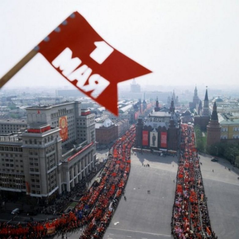 Вид на колонны на первомайской демонстрации из гостиницы «Интурист», 1 мая 1983 года, Москва
