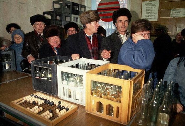 Очередь в пункте приема стеклопосуды, 1990 год, СССР