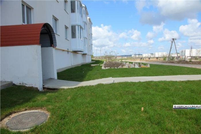 Построенные в Керчи новые трехэтажные дома для переселенцев не смогли пройти испытания первыми дождями. Из-за низкого качества проделанных работ на тротуарных дорожках стали появляться провалы, просел цоколь одного из домов, образовав большую трещину, а подвал заполнился водой.