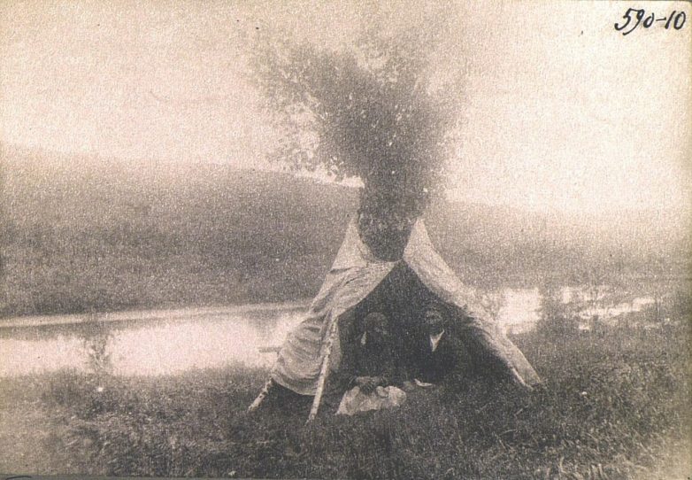 Шалаш, в котором скрываются сбежавшие жених и невеста. Томская губерния. Российская империя. Начало XX века.
