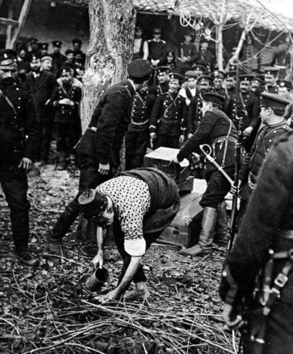 Турок омывает ноги для последней молитвы, в то время как болгарские солдаты готовят для него виселицу, 1913 год.