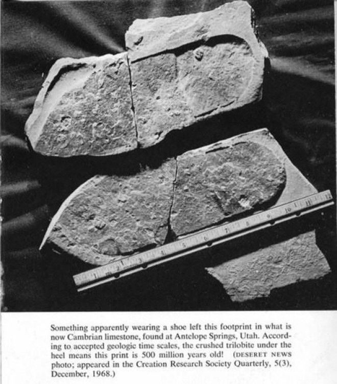«…На нашей Земле археологи обнаружили некогда жившее существо, называемое трилобитом. Оно существовало 600–260 млн лет тому назад, после чего вымерло. Американский ученый нашел окаменелость трилобита, на которой виден след человеческой ноги, причем с ясным отпечатком ботинка. Не делает ли это историков предметом шутки? Исходя из эволюционной теории Дарвина, как мог существовать человек 260 млн лет назад?»