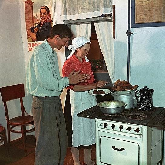 В колхоз «Первое мая», недалеко от Грозного, провели газ. Как писал корреспондент «Огонька», «газ делал все: отапливал, кипятил, резал, вулканизировал, готовил обед и даже выращивал рассаду и ранние овощи». А теперь попробуйте представить, какое кулинарное счастье наступило для Татьяны Михайловны Ларионовой и ее сына Василия (на фото): больше не надо ничего разжигать, повернул ручку плиты и огонь горит — готовь, сколько влезет. Да к тому же экономия: за восемь месяцев Татьяна Михайловна уплатила 160 рублей за газ, а дрова и уголь, поведала она нашему журналу, обошлись бы в тысячу...