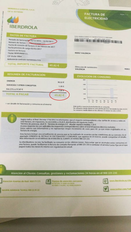 Тут все сложнее и проще одновременно. Рассматриваем квартиру в 41 метр в центре Валенсии. Дом старый, а значит отопления нет. Как и платы за это. Но зимой в Испании бывает холодновато, поэтому повсеместно используют электронагреватели. Значит плата за электроэнергию может достигать критических величин. Стоимость электроэнергии 0,136 евро за 1 кВт, которую нужно оплачивать один раз в 2 месяца, приблизительно 40-50 евро.Месяц получается 20-30 евро