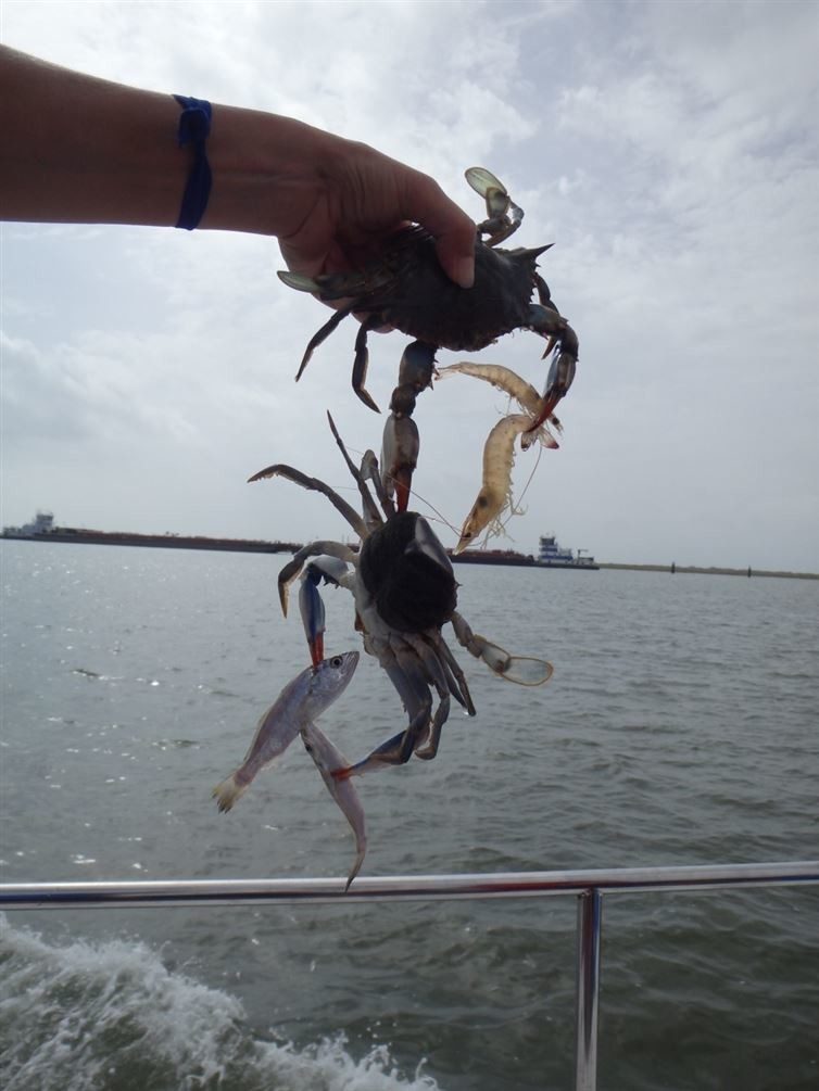 Рыбак выловил синего краба, который поймал две креветки и еще одного синего краба с двумя рыбками