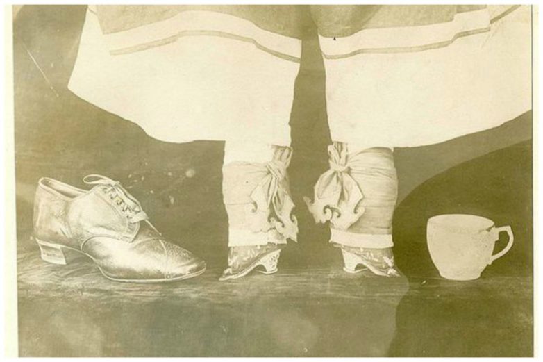 Ноги китайской женщины, искусственно уменьшаемые с помощью тугого бинтования, по сравнению с чашкой чая и обувью американской женщины.