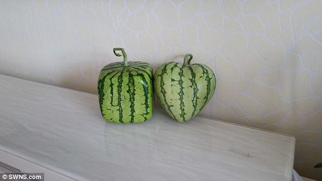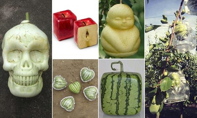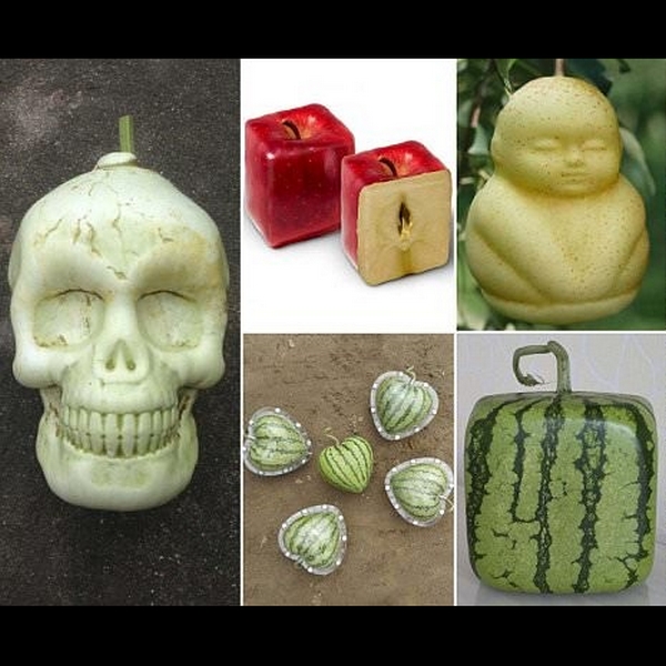 Квадратный арбуз, груша в виде Будды, огурцы в форме сердца и другие креативности — выращиванием таких необычных фруктов и овощей занимается китайская компания Fruit Mould Co.