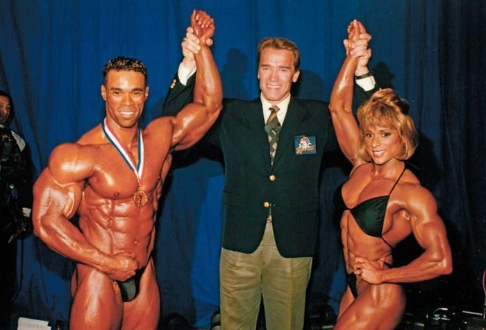 Я ушел из профессионального культуризма в 1980 году, но не терял связи с этим спортом. Здесь я поздравляю победителей первенства «Арнольд классик» 1994 года Кевина Леврона и Лору Креваль.