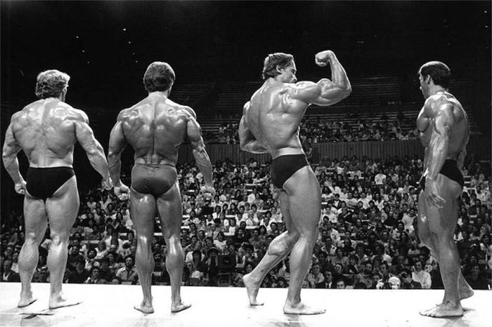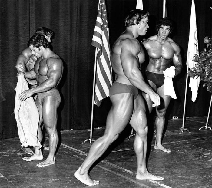 Я выхожу на сцену Мэдисон-сквер-гарден защищать корону Мистер Олимпия в 1974 году. У меня за спиной Франко и Фрэнк Зейн, а впереди вундеркинд Лу Ферриньо, пристально наблюдающий за мной.