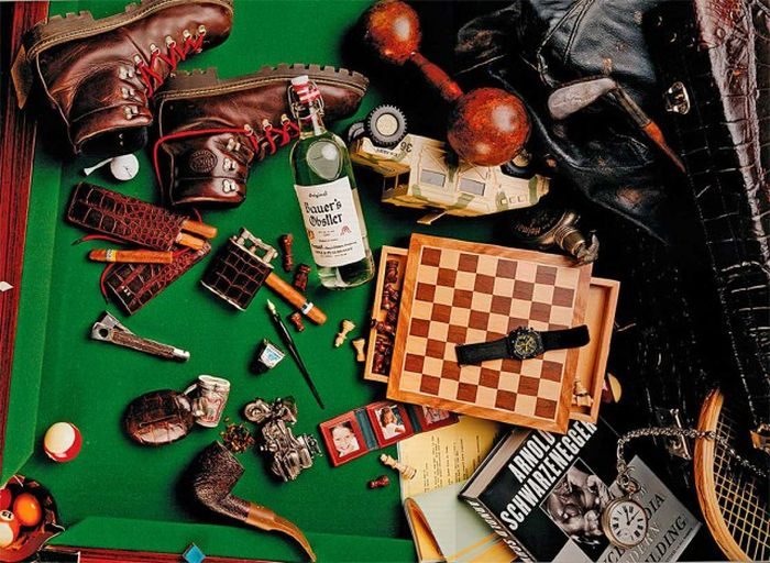 На мое пятидесятилетие 30 июля 1997 года Мария преподнесла мне сюрприз — подарила этот плакат. На этом коллаже собраны все мои привычки и увлечения: пешие прогулки по горам, «хаммер», дорогие трубки и часы, рисунки пером и тушью, сигары и шнапс, отцовство, шахматы и бильярд, теннис и гольф, киносценарии, мотоциклы и кожа, история тяжелой атлетики и будущее культуризма. С тех пор список моих интересов только вырос.