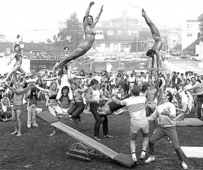 Пляж Венис-Бич в Калифорнии представлял собой сцену под открытым небом, где любили показывать себя гимнасты, цирковые артисты и культуристы. Здесь мы устраиваем импровизированное акробатическое представление.