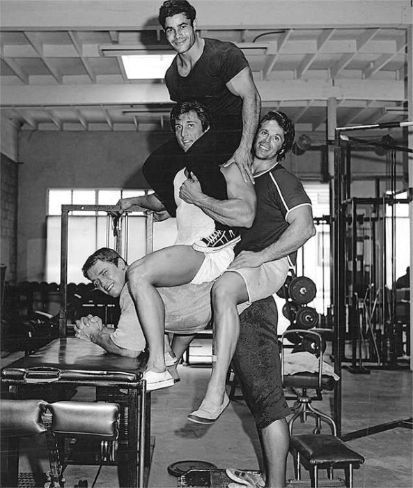 Мои партнеры по тренировкам (сверху вниз) Франко Колумбу, Фрэнк Зейн и Пит Капуто в клубе Голда взгромоздились на меня, когда я выполнял «ослиный шаг», накачивая икроножные мышцы.