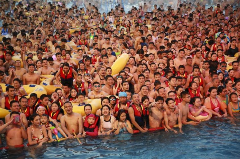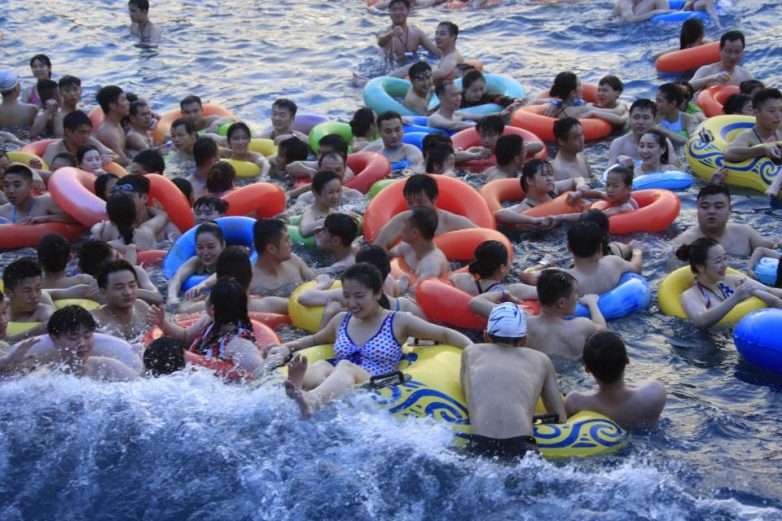 Сейчас во многих регионах Китая очень жаркая погода, температура воздуха достигает 50 градусов. Люди ищут спасение от летнего зноя в различных бассейнах и аквапарках. Там сейчас настоящий аншлаг, буквально яблоку негде упасть.