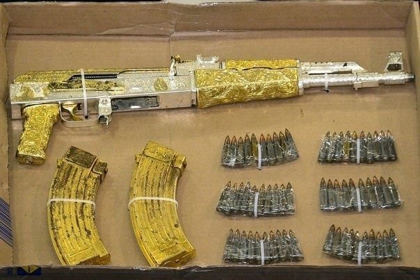 Настоящий позолоченный автомат принадлежал одному из лидеров наркокартеля La Resistencia («Сопротивление») Рамиро Пососу Гансалесу. Этот автомат был изъят у Рамиро при его задержании.