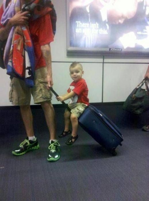 Для детишек можно сделать откидную специальную лавочку на чемодане. Очень интересная мысль.