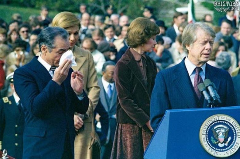 Шах Ирана вытирает слезы (выступившие из-за слезоточивого газа) на выступлении президента Картера. Вашингтон. Округ Колумбия. СШA. 15 ноября 1977 года.