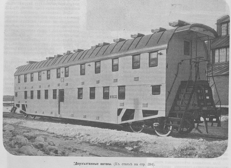 Двухэтажный пассажирский вагон, созданный на Тверском вагоностроительном заводе. Российская империя, 1905 год.