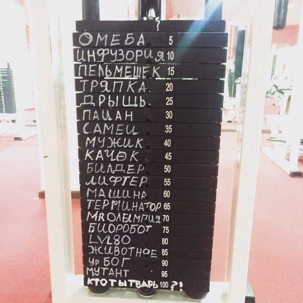 Все, кто когда-либо ходил в качалку, должны помнить, какая атмосфера там царит. Но даже в этой напряженной работе по совершенствованию своего тела, качки не упускают возможности пошутить.