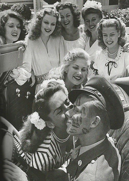 Звезды пин-апа расцеловали рядового армии США. 1944 год.