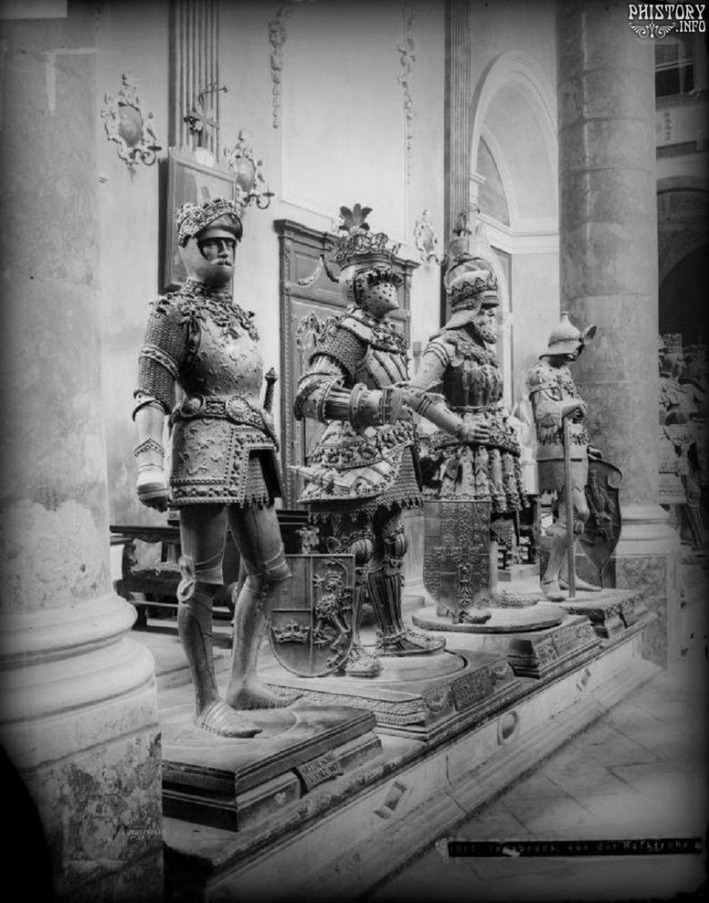 Статуи короля Артура, Фердинанда Португальского и герцога Эрнеста Железного в гробнице императора Максимилиана I. Инсбрук. Австро-Венгрия. 1895 год.