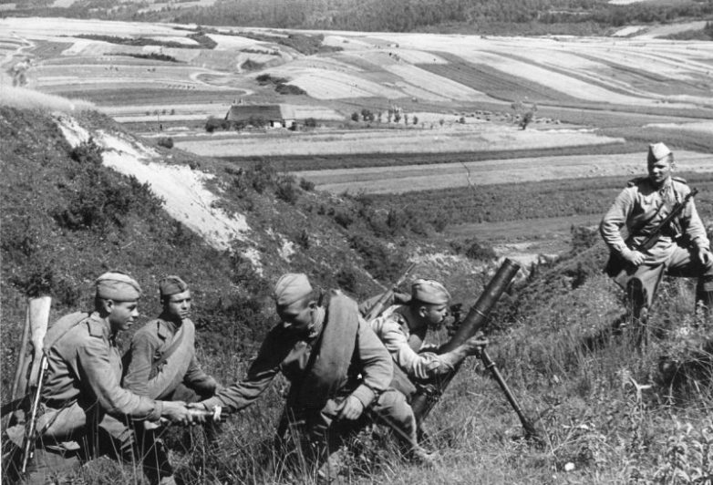 Расчет 82-мм батальонного миномета образца 1941 года (БМ-41) из 6-й гвардейской мотострелковой бригады 5-го гвардейского стрелкового корпуса ведет огонь по противнику на Курской дуге.