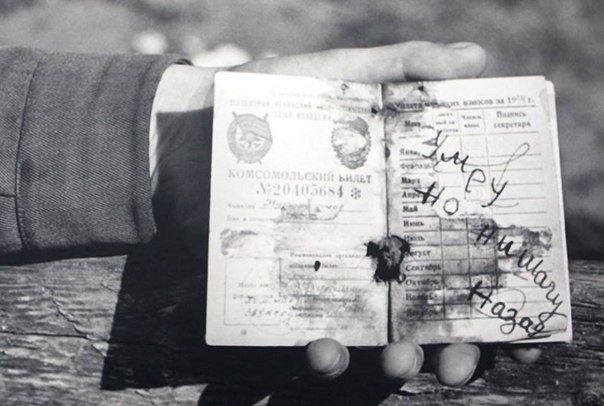 Комсомольский билет (№20405684) солдата Советских войск Нурмаханова, казаха по-национальности. Слова на страницах: «Умру, но ни шагу назад». 3-й Белорусский фронт.
