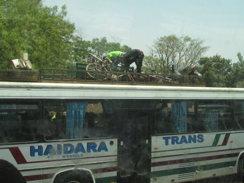 Если вы едете на таком транспорте, ваши вещи тоже будут ехать на крыше. Водитель с помощником, конечно, всё это заматывают сетками, и, по идее, оно не должно упасть в дороге. На практике бывает всякое. Учитывая качество любых работ в Африке, можно только надеяться, что ваш рюкзак по дороге не выпрыгнет случайно.