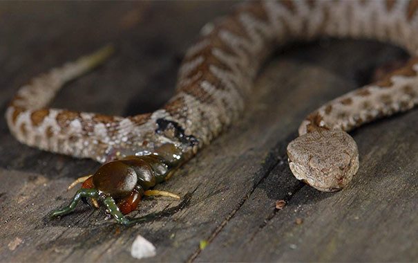 Сороконожка, съеденная гадюкой, прогрызла обратный путь