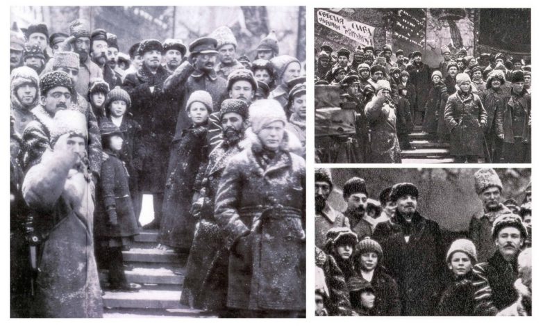 Возле Большого театра в мае 1920 года. Ленин выступает с речью, а на ступенях справа стоит Троцкий, за которым частично виден Каменев. Фальсификация этой фотографии – один из первых и, безусловно, самый известный пример фоторетуши сталинской эпохи. Ещё при жизни Ленина снимок стал культовым, но исключённый из большевистской партии Троцкий и открыто критиковавший Сталина Каменев исчезли с этого кадра и не появлялись даже при Горбачёве.