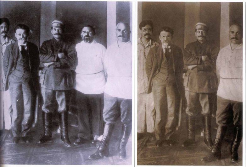 В оригинале: Антипов, Сталин, Киров, Шверник и Комаров после разгрома «ленинградской оппозиции», 1926 год. Затем из кадра «исчезает» Комарова (расстрелян). В 1940 году снимок публикуют в издании «История СССР» с вырезанным Антиповым (тоже расстрелян). В 1949 году выходит «Иосиф Сталин. Краткая биография», где фотографию аккуратно ретушируют, убрав и Шверника. На основе этой же фотографии Исаак Бродский написал портрет, в котором изобразил одного лишь Сталина.