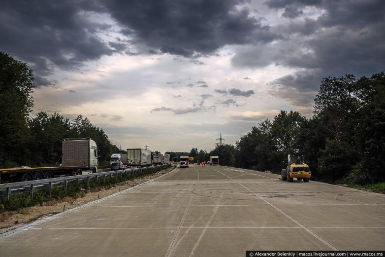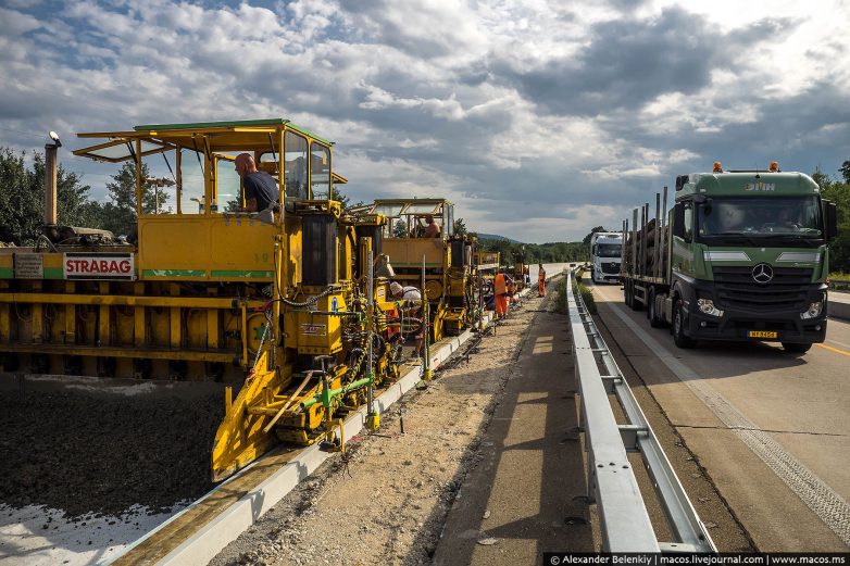 Идеально гладкое покрытие ложится, словно масло на хлеб. Но больше всего на стройке меня впечатлили не инновации, а люди. Машины оставили им не так много тяжёлой работы, контролировать и проверять. Но видели бы вы, с какой любовью и практически нежностью (по отношению к дороге) эти суровые рабочие мужики делают своё дело. Ни одного небрежного движения, ни намёка на халтуру. Они строят дорогу для себя и своих детей, для своей страны. Им потом по ней передвигаться, зачем делать плохо? Но здесь я не открыл “Америку», немцы известны таким отношением к делу.