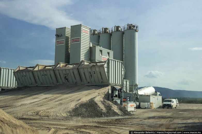Самосвалы привозят материалы, цементобетонную смесь двух сортов (для верхнего и нижнего слоя покрытия) с расположенного поблизости мобильного завода.