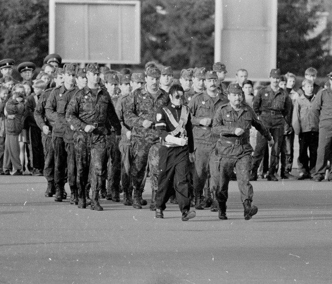 Майкл Джексон марширует с российскими солдатами, 1993 год.