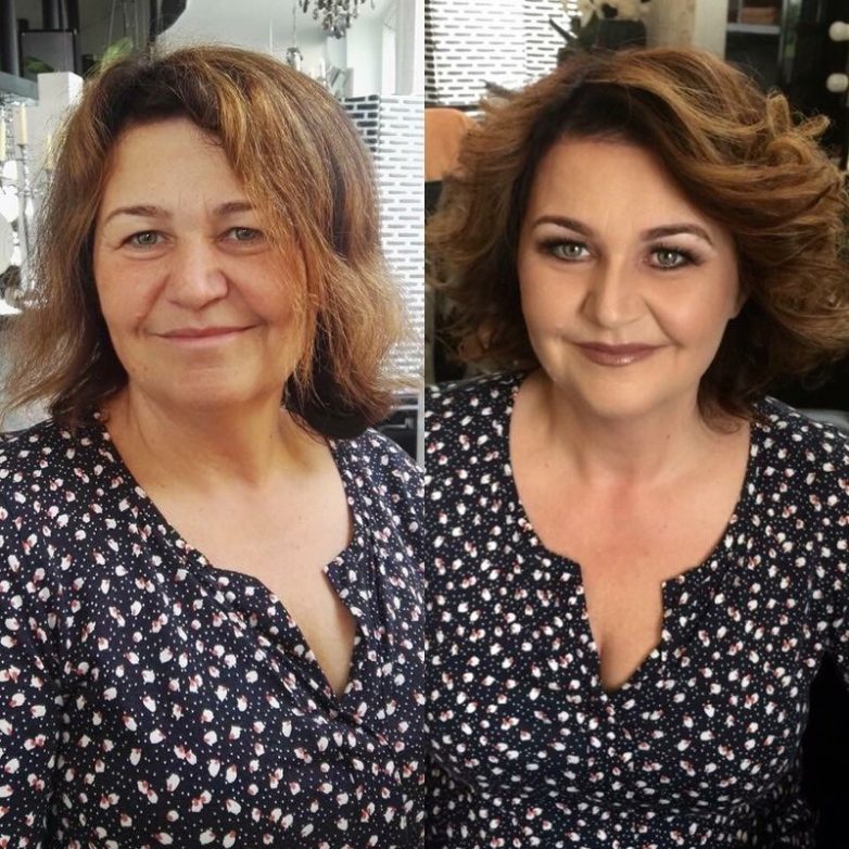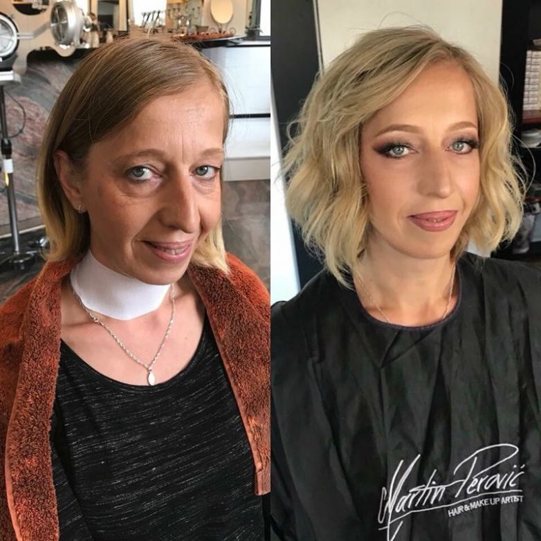 На первой паре фоток что-то не так. Подбородок у женщины справа острый, подтянутый, а у женщины слева скругленный, оплывший. Этого визажист не сделает, только пластический хирург.