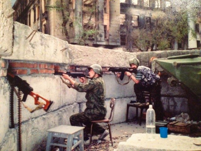 Бойцы отряда группы «Альфа» в бою у здания УФСБ г. Грозного, летом 1996г. Первая чеченская война.