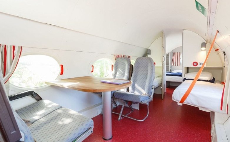 Бывший самолет оборудован современной мебелью и рассчитан на четверых постояльцев. Внутри есть кухня, туалет и душ.