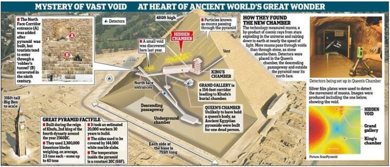 Учёные совершили грандиозное открытие с помощью частиц, которые проникают в породу. Детекторы, установленные внутри всей пирамиды, в том числе и в Королевской палате. обнаружили пустое пространство, которое получило название ScanPyramids Big Void.