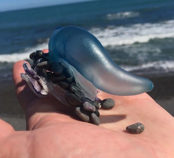 «Это часть сифонофоры — свободноплавающего морского животного. Воздушный пузырь служит им в качестве паруса. Не трогайте их! Они могут серьезно ужалить (как медузы)».