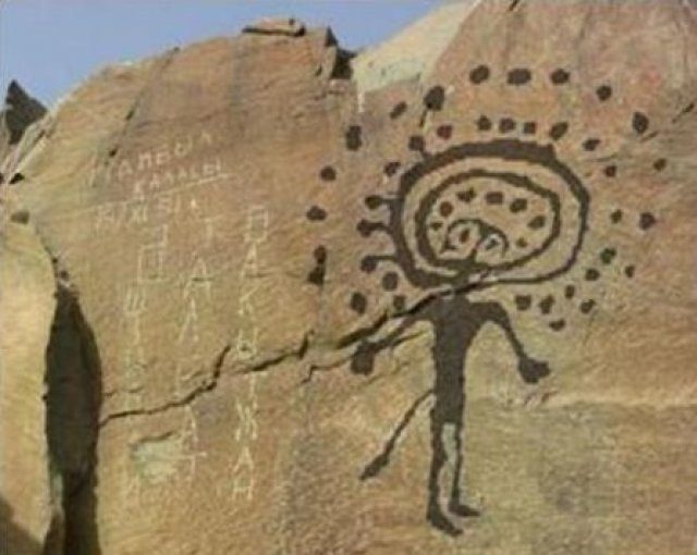 Некоторые считают, что знаменитый петроглиф «Человек-солнце», найденный близ Алматы, является наскальным портретом инопланетянина