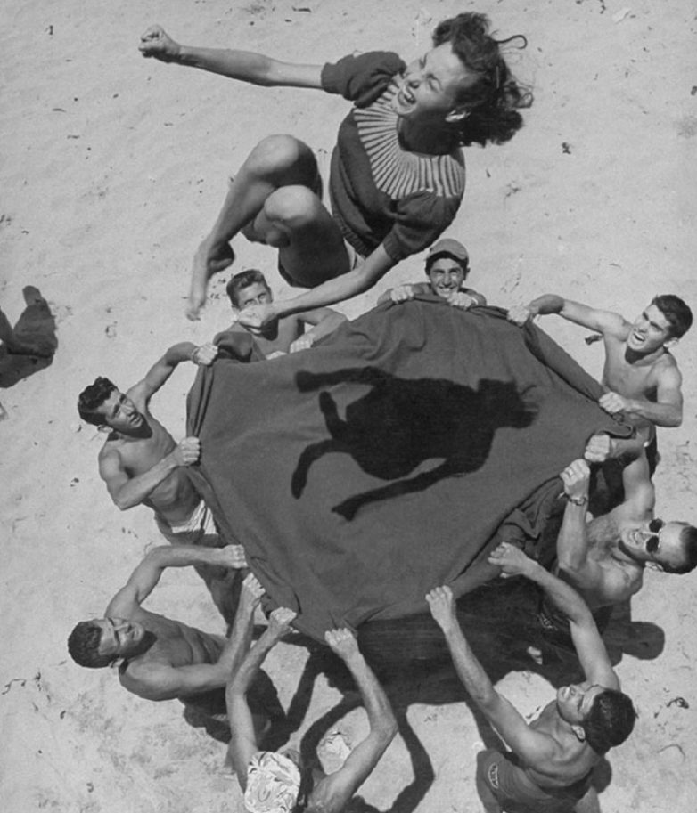 17. Ребята подбрасывают свою подругу в воздух с помощью пляжной подстилки, 1948