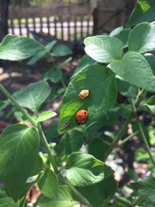«Моей подруге удалось увидеть три стадии жизненного цикла божьей коровки на одном листочке!»