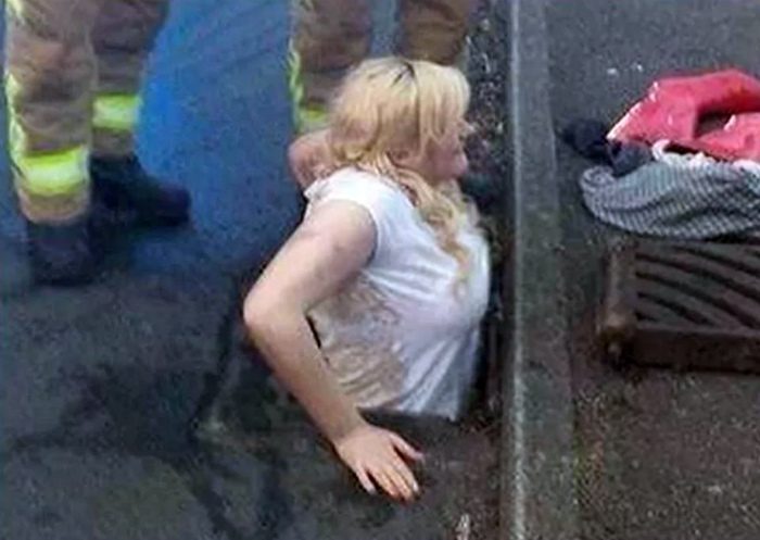Велосипедист не соблюдает правило: «Сел за руль береги жизнь человека». Что делает пышная и фигуристая блондинка в ливневой канализации?