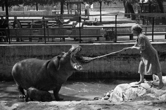 Чистка зубов гиппопотаму в Московском зоопарке, 1944 год.