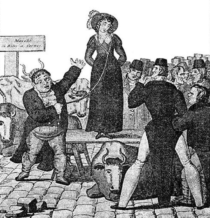 Когда на дворе была эпоха индустриальной революции, среди англичан было много несчастливых браков. Однако разводились очень редко, ведь развод был процессом дорогим и обременительным. Поэтому ушлые англичане придумали как избавляться от ненавистных жен — продавать.