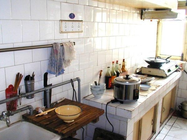 Не кухни, а кухоньки. Места хватает только для раковины, пары шкафчиков и плиты. Плита всегда газовая, связано это с тем, что приготовление еды в воке — большой сковороде с высокими краями (именно такие блюда составляют основу китайской кухни) — требует очень сильного огня. При этом центрального газоснабжения тоже нет. На кухнях стоят баллоны со сжиженным газом.