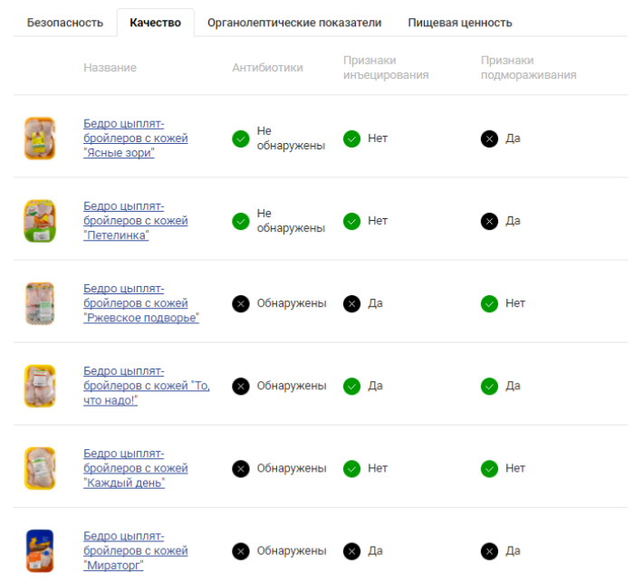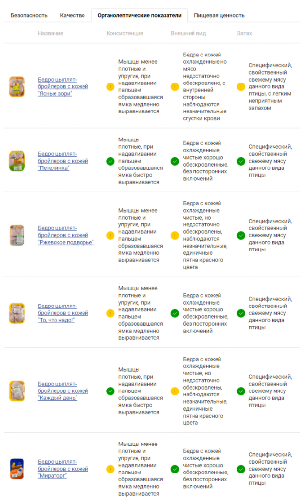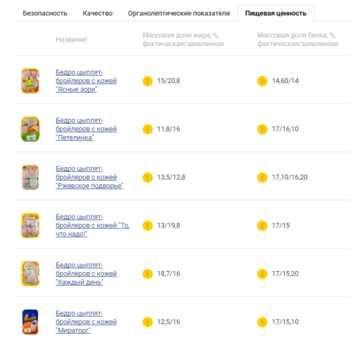 Тогда информация для вас! С пищевой ценностью образцов все тоже оказалось неидеально. Во всех бедрах, кроме продукта бренда «Ясные зори» оказалось белка меньше, чем указано в маркировке. Прочие показатели пищевой ценности также существенно разнятся с заявленными. Хотя, по сравнению с вышеперечисленными проблемами, это, конечно, нюансы.По совокупности нарушений все образцы внесены в Черный список Росконтроля.