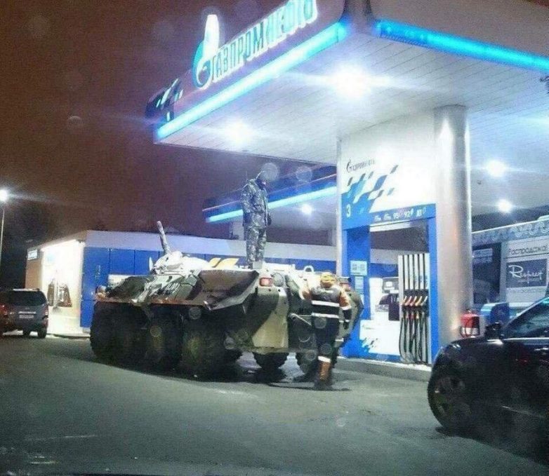 БТР на заправке? Ничего удивительного, у него внутри КАМАЗовский двигатель с усиленным коленвалом. А кушать солярку изволит.