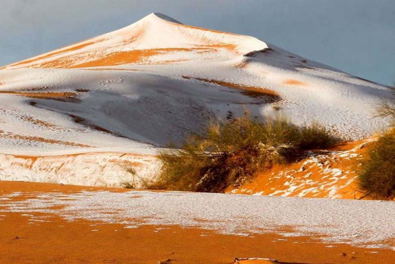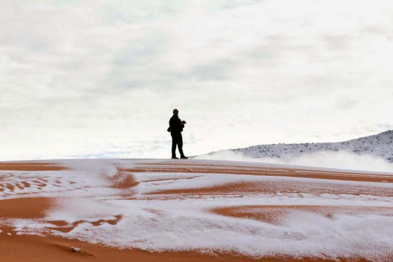 И хоть звучит это как полный бред, на самом деле осадки в виде снега здесь выпадают уже в третий раз за последние 40 лет, и в последний раз это случилось совсем недавно — в прошлом году, когда белые кристаллики льда наблюдались вблизи города Айн-Сефра (Алжир).