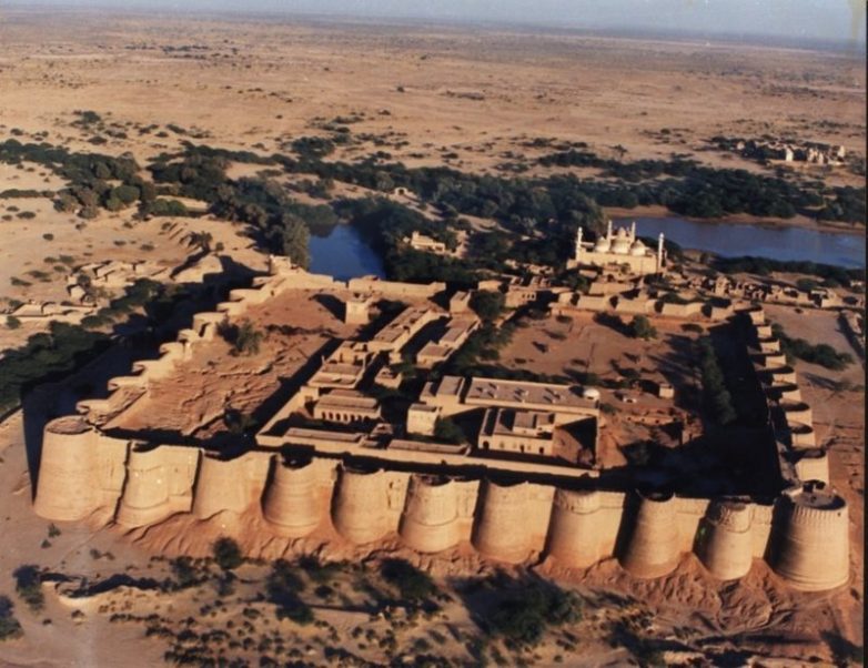 Форт Деравар – величественная крепость посреди пустыни Холистан, относящаяся к эпохе средневековья и являющаяся одной из наиболее ярких и неординарных достопримечательностей Пакистана. Сооружение обладает квадратной планировкой и по периметру охватывает 1,5 км, а в диаметре достигает до 1 км, стены возвышаются на 30 метров и имеют 40 башен для наблюдения.